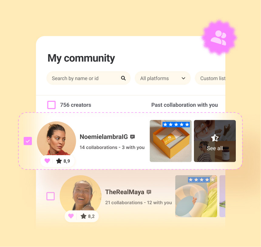 Utilizza la funzione My Community per raggruppare i tuoi creator con le migliori performance in un unico posto. Questi sono i collaboratori fidati a cui puoi rivolgerti di nuovo per vari tipi di campagna, formati e obiettivi. Poiché hai già costruito un rapporto, l’attivazione sarà più rapida, facile e d’impatto.