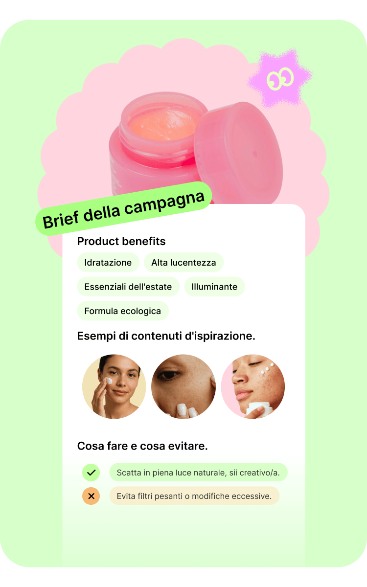 Dalla comprensione di come i creator vivono la tua campagna, alla scrittura di brief coinvolgenti, fino a costruire relazioni autentiche e durature, fondate sulla creatività condivisa: è qui che nasce la vera sinergia tra marchio e creator.